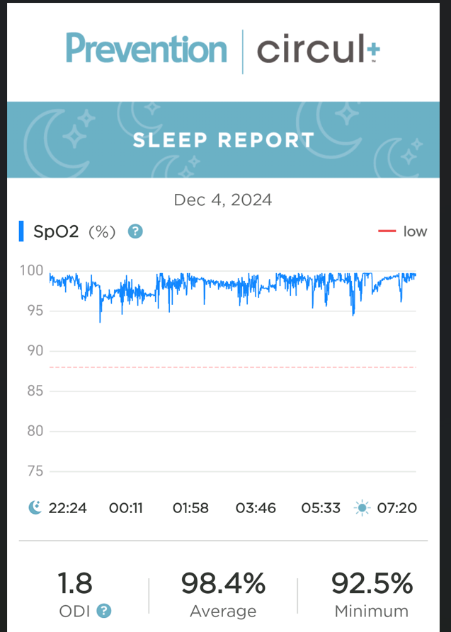 Use the circul+ mobile app to graphically display your overnight sleep tracking, including blood oxygenation (SpO2%), heart rate (HR), oxygen desaturation index (ODI) and 4 Sleep Stages (Awake, Light, Deep and REM Sleep) to inform lifestyle changes that may improve sleep, enhance metal clarity and reduce fatigue.